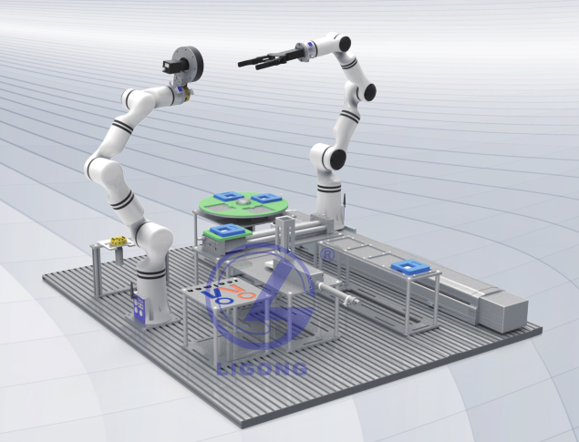 ★1、機械臂:平臺上安裝有兩臺輕量化機械臂。一臺固定安裝并配有工業(yè)相機,用以物料識別與定位。一臺安裝在移動導(dǎo)軌之上,用來進行產(chǎn)品托盤的出入庫。