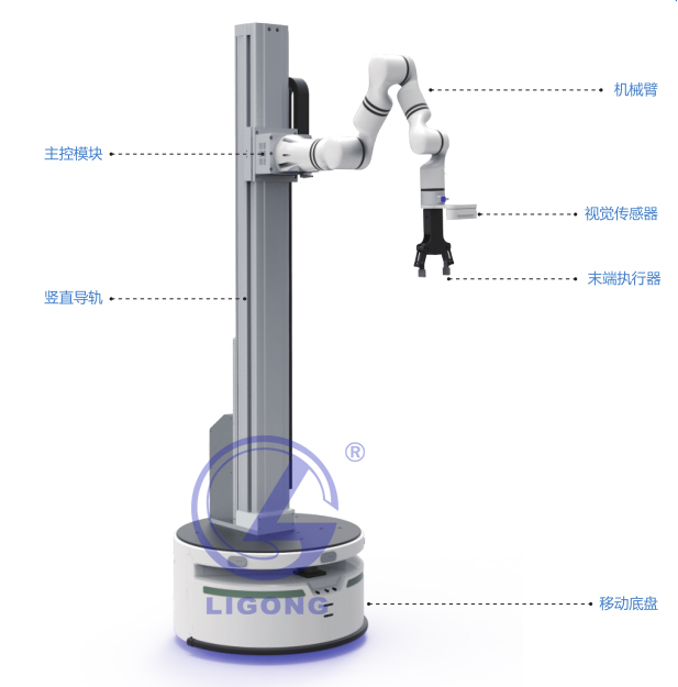TYK-FR01型 人工智能機(jī)器人實(shí)訓(xùn)科研平臺(tái)將移動(dòng)底盤、豎直導(dǎo)軌、機(jī)械臂、視覺傳感器、末端工具通過主控模塊集成于一體。與傳統(tǒng)的“機(jī)器人+AGV”形式的復(fù)合機(jī)器人相比,增加了升降系統(tǒng),進(jìn)一步擴(kuò)大了機(jī)器人的工作空間。同時(shí)在機(jī)械臂末端不僅配備了執(zhí)行工具,還集成了一款開源的3D視覺傳感器,來保證機(jī)器人在充足的工作空間下,具有更高的任務(wù)準(zhǔn)確性和靈活性。復(fù)合升降機(jī)器人為物流倉儲(chǔ)、無人貨柜等應(yīng)用場景,提供了一體化集成方案,實(shí)現(xiàn)機(jī)器人在結(jié)構(gòu)化場景內(nèi),進(jìn)行無軌導(dǎo)航及路徑規(guī)劃,同時(shí)滿足三維空間作業(yè)能力的需求,實(shí)現(xiàn)全范圍、大空間的自主移動(dòng)、自主動(dòng)態(tài)抓取。