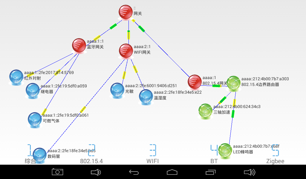 網(wǎng)關(guān)應(yīng)用軟件通過CoAP服務(wù)和串口服務(wù),將WiFi、藍牙、IEEE802.15.4、以及ZigBee感控節(jié)點數(shù)據(jù)解析處理,在網(wǎng)關(guān)的Mesh拓撲圖中實時流動地顯示傳感器數(shù)據(jù)的上、下行走向;