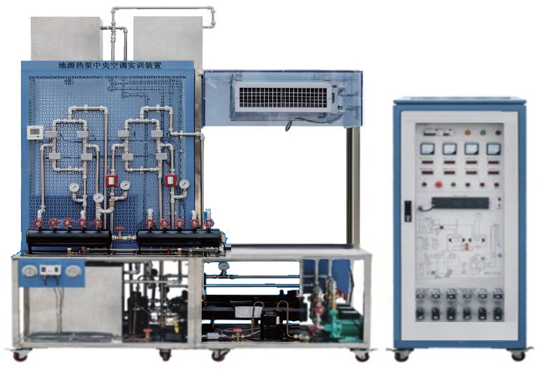 地源熱泵空調(diào)系統(tǒng)由制冷機(jī)組、模擬水井、空調(diào)系統(tǒng)、生活衛(wèi)生供水系統(tǒng)、控制系統(tǒng)、實(shí)訓(xùn)臺等組成。實(shí)訓(xùn)臺采用不銹鋼底架結(jié)構(gòu),結(jié)構(gòu)堅(jiān)固,造型美觀大方;桌面用于安裝電源控制屏并提供一個(gè)寬敞舒適的工作臺面。