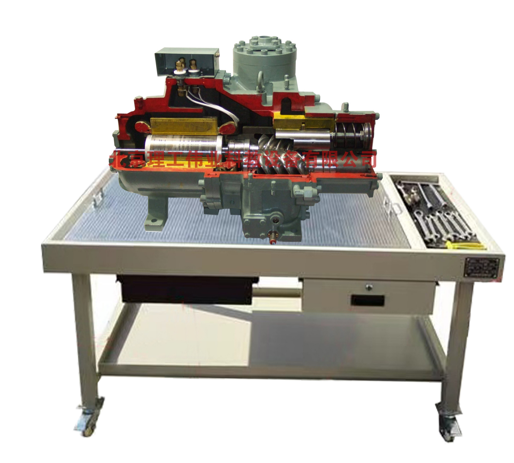 7、小型螺桿式制冷壓縮機實訓(xùn)裝置包含一臺1:1實物模型的半封閉螺桿壓縮機,此模型沿軸線做四分之一剖開,剖開面做防銹處理。