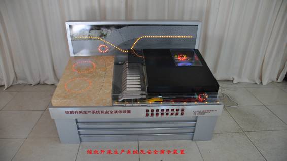 TYK -MZC03型 綜采工作面及頂板管理安全演示裝置直觀反映出綜采工作面生產(chǎn)工藝、巷道布置、通風系統(tǒng)、綜合防塵、隔爆設施、瓦斯抽放、瓦斯監(jiān)測、運輸系統(tǒng),利用聲、光、電、機械傳動技術(shù)顯示工藝流程及頂板巖層的移動及應力分布。直觀體現(xiàn)割煤、移架和推溜。通過支架的移動,展現(xiàn)初次放頂、初次來壓、周期來壓、工作面前后方應力的分布形態(tài),上覆巖層的移動特征及垮落帶,裂隙帶、沉降彎曲帶“三帶”分布規(guī)律和地表沉降規(guī)律。利用聲、光、電、機械傳動顯示工藝流程。
