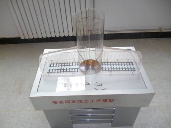 TYK-MXD01型 巷道峒室施工工藝模型采用有機(jī)玻璃、電腦雕刻,并利用模型和發(fā)光管顯示了巷道峒室施工生產(chǎn)系統(tǒng)、施工順序、主要設(shè)備設(shè)施。模型有風(fēng)鎬、臺鉆、轉(zhuǎn)載機(jī)、皮帶機(jī)、雙風(fēng)機(jī)雙電源、瓦斯報(bào)警斷電裝置、灑水水幕、隔爆水槽棚支護(hù)材料及形式等。 規(guī)格:1000mm×600 mm×1300 mm