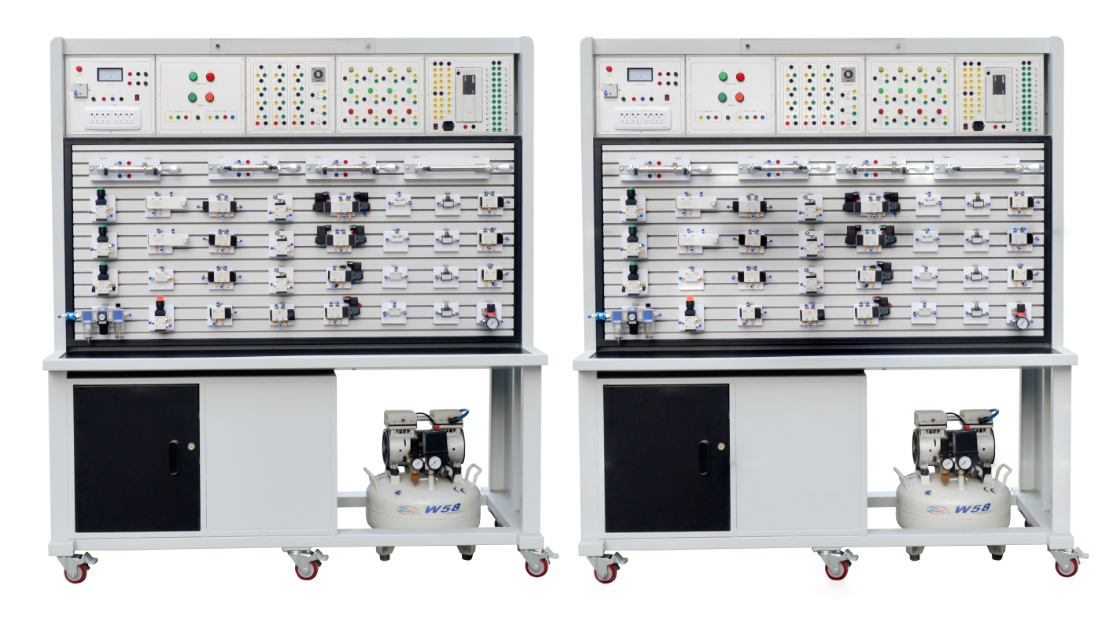 本實訓(xùn)裝備,由實訓(xùn)臺桌、氣動系統(tǒng)回路實訓(xùn)操作面板部分、電氣控制部分等組成,電氣部分主要由PLC模塊、繼電器模塊、電源模塊、按鈕模塊等部分組成。實訓(xùn)臺主體框架采用鋁木結(jié)構(gòu)組裝完成,臺架重量較輕且安裝了萬向輪,可方便實訓(xùn)臺的移動。臺架分上下兩層結(jié)構(gòu),上面可放置電氣模塊,下面是實訓(xùn)屏,實訓(xùn)屏采用帶槽鋁合金結(jié)構(gòu),方便各氣動元件的安裝和拆卸,學(xué)生可以根據(jù)實驗需要在實訓(xùn)屏上任意搭建氣動回路,組成具有一定功能的氣動系統(tǒng)。實訓(xùn)臺采用模塊式結(jié)構(gòu),便于組合與擴(kuò)展,提高了設(shè)備空間的利用率,并采用二合一的雙面實訓(xùn)操作面板,更加有效的合理的利用實訓(xùn)空間。