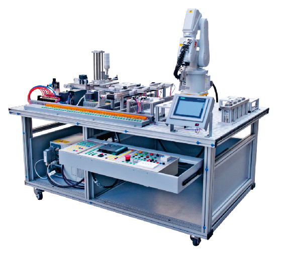 該平臺各組件均安裝在型材桌面上,機(jī)械結(jié)構(gòu)、電氣控制回路、執(zhí)行機(jī)構(gòu)相對獨(dú)立,采用工業(yè)標(biāo)準(zhǔn)件設(shè)計(jì)。通過此平臺可以進(jìn)行機(jī)械組裝、電氣線路設(shè)計(jì)與接線、PLC編程與調(diào)試、工業(yè)機(jī)器人編程與調(diào)試等方面訓(xùn)練。
