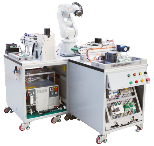 該套設(shè)備包含了機(jī)器人末端快速換裝法蘭、工業(yè)機(jī)器人、步進(jìn)驅(qū)動器、步進(jìn)電機(jī)、可編程邏輯控制器、光纖傳感器、變頻器、三相異步電動機(jī)等多功能一體化實訓(xùn)裝備,裝備分為三個組合式工作臺,每個工作臺配備一臺PLC可編程邏輯控制器完成一道既定工序,工作臺與工作臺之間PLC通過485串口通訊方式進(jìn)行連接。