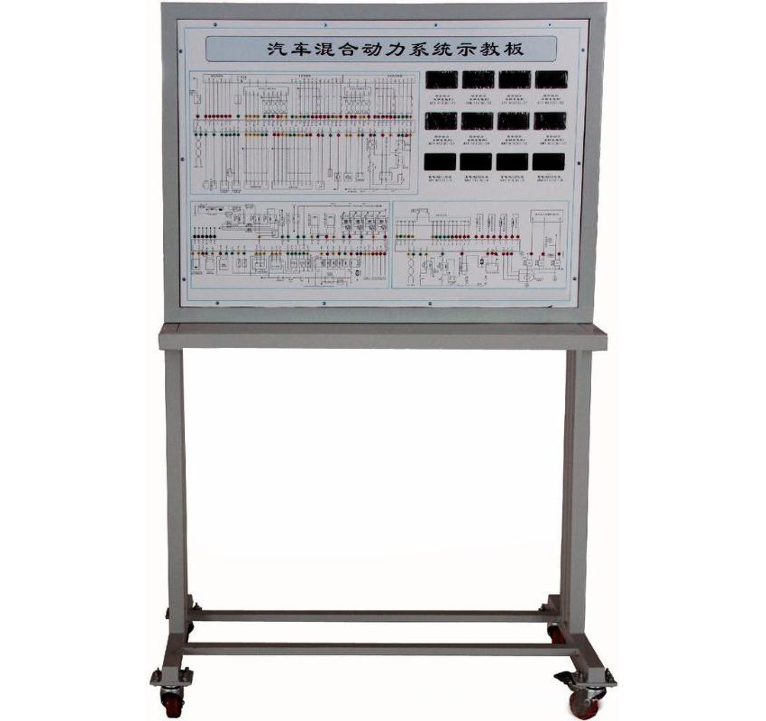 點火開關(guān)、混合動力原理圖、模擬裝置的直流電動機、發(fā)光二極管組件、制動開關(guān)等。12V開關(guān)電源、大型彩色噴繪電路原理圖、控制面板、可移動臺架、使用說明書及實訓(xùn)指導(dǎo)書等。