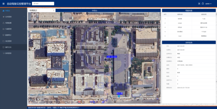 顯示項目園區(qū)總體地圖,可選擇不同運營線路,顯示線路路線及車輛??康恼军c。車輛在地圖上的位置以圖標(biāo)形式標(biāo)注,離線、作業(yè)、空閑、異常車輛將以不同的顏色在地圖上顯示,點擊車輛圖標(biāo)后,將顯示車輛的Vin碼、車牌號、業(yè)務(wù)狀態(tài)、車輛狀態(tài)、控制模式、坐標(biāo)、速度、檔位、轉(zhuǎn)角、急停開關(guān)觸發(fā)情況、電量、更新時間等信息。