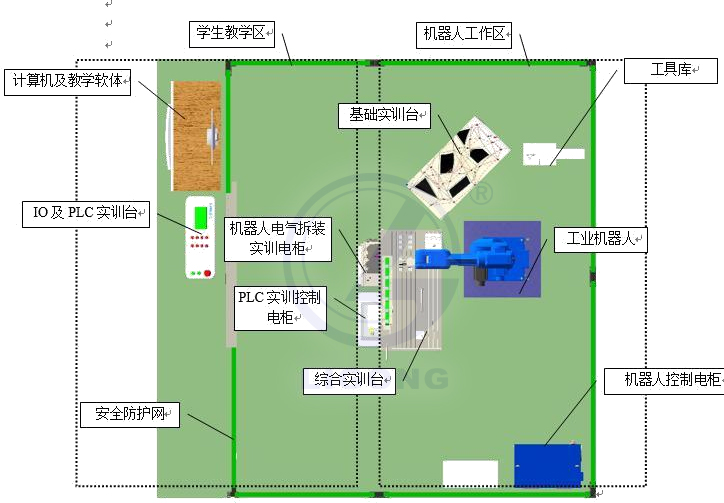 ? ? LGH-JR12型?工業(yè)機(jī)器人綜合教學(xué)實(shí)訓(xùn)平臺(tái)整體占地尺寸為 4000mm*4000mm*1500mm(詳見下圖)。工作站含 LG-ZN612型工業(yè)機(jī)器人及其控制柜 1 套、基礎(chǔ)實(shí)訓(xùn)臺(tái) 1 套、綜合實(shí)訓(xùn)臺(tái) 1 套、IO 及 PLC 操作臺(tái) 1 套、安全防護(hù)設(shè)施 1 套、電腦及電腦桌椅(選配)等。
