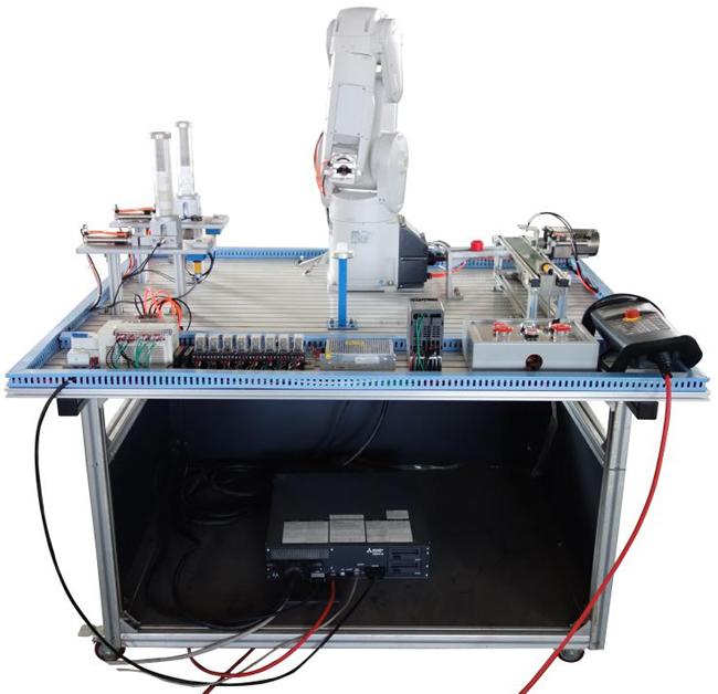 ? ? ? ?LG-IOR03型?六自由度機器人實訓(xùn)裝置采用三菱工業(yè)機器人;模擬機器人有工業(yè)現(xiàn)場的工作環(huán)境以及狀態(tài)(散件組裝成品,拿取等)。試驗臺采用工業(yè)鋁合金型材板,并有開放式T型槽設(shè)計,十分方便拆卸以及任意添加元器件。所有元器件均采用進(jìn)口高品質(zhì)元件(氣動元器件采用SMC等),以保證運行狀態(tài)穩(wěn)定。本裝置主要模擬機器人裝配控制。由供料單元1提供一個圓形中間有孔的工件,當(dāng)工件送出后,機器人將其快速抓取到裝備單元,如果工件的圓形孔朝下,需要將工件進(jìn)行180度翻轉(zhuǎn)放好;由供料單元2提供一個圓柱形工件,當(dāng)工件送出后,機器人將其抓取送到裝備單元,將其放入1單元提供的工件孔中,完成裝配。*后將裝配好的工件e用傳送帶移至存放區(qū),存放時按順序排好工件。