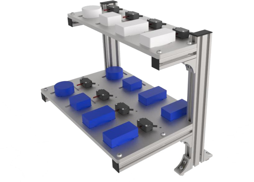 ? ? 智能料庫分為上下兩層,每層設置?4?個工位。每個工位都可以放置正方形、長方形或圓形的物料。同時,每個工位安裝有傳感檢測裝置,可自行判斷此工位是否有物料。
