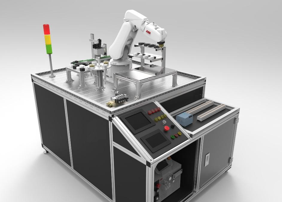 ? ? 另外,模塊化機械設計是工業(yè)發(fā)達國家近二十年來一直采用的一種先進的機械產(chǎn)品設計方法。學生自主設計臺面功能模塊可作為《機械設計》課程的綜合實驗部分。學生根據(jù)課上所學機械原理和機械設計的基礎知識,在三維設計軟件中實現(xiàn)自己的設計想法,可自行設計機器人末端工具,臺面工裝、生產(chǎn)流水線及視覺分揀等。學生也可組隊完成整個臺面的重新規(guī)劃,利用設備本體提供的氣路和電路總線,賦予臺面新的設計亮點。此部分也可作為機械設計、機械制造、機電一體化、工業(yè)設計等專業(yè)的畢業(yè)設計內(nèi)容。? ? 此工作站整體外形統(tǒng)一,具有外部通訊接口,所以有配置靈活、便于擴展的優(yōu)點。各工作站既可以作為獨立的功能個體,完成機器人的實訓任務。也可以作為相互的擴展模塊,通過電纜緊密拼裝后組成一個整體的結(jié)構(gòu)。某一個工作站作為主控,其他工作站協(xié)同。通過之前所述不同的設計賦予每個工作站不同的功能,?可添加節(jié)拍控制、生產(chǎn)管理、工業(yè)系統(tǒng)工程等管理思路,使其整體實現(xiàn)更加多元化的功能。
