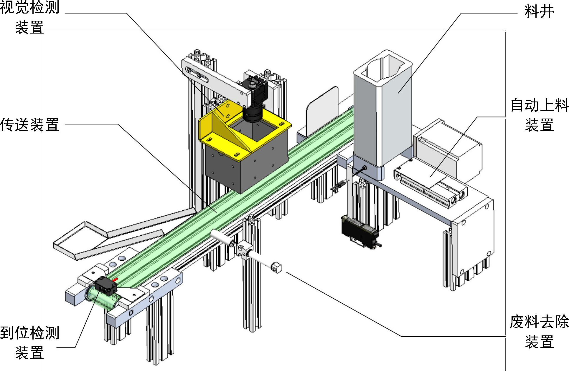 ? ? 多功能料井為鋁合金材質(zhì),可兼容正方形、長方形和圓形三種形狀的物料塊以固定的姿態(tài)到達料井底部,料井底部設置有反射型光纖傳感器,當傳感器檢測到有物料落下時,觸發(fā)自動上料裝置,雙軸氣缸將物料推送到傳送裝置上。傳送裝置上電機配合精密減速器驅(qū)動傳送帶模擬真實工廠的流水線,在流水線的中間設置有視覺檢測裝置,檢測合格產(chǎn)品可以到達傳送帶的末端,不合格產(chǎn)品作為廢料,由廢料去除裝置推出傳送帶。在傳送帶末端配有精密傳感器感應產(chǎn)品是否到位。