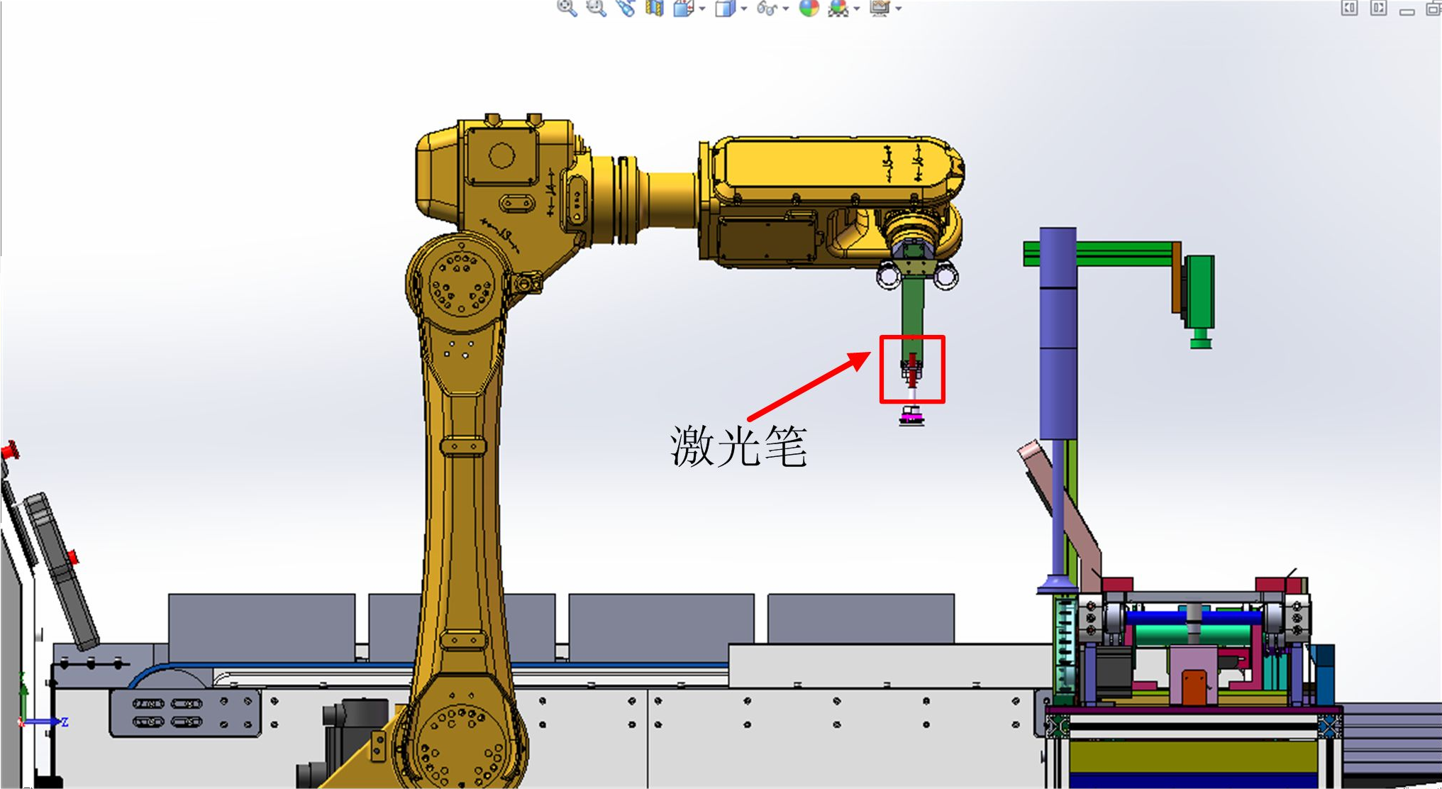 如圖?2-4?所示,在工業(yè)機(jī)器人末端夾具上安裝了一個(gè)激光筆,具體調(diào)節(jié)步驟如下: