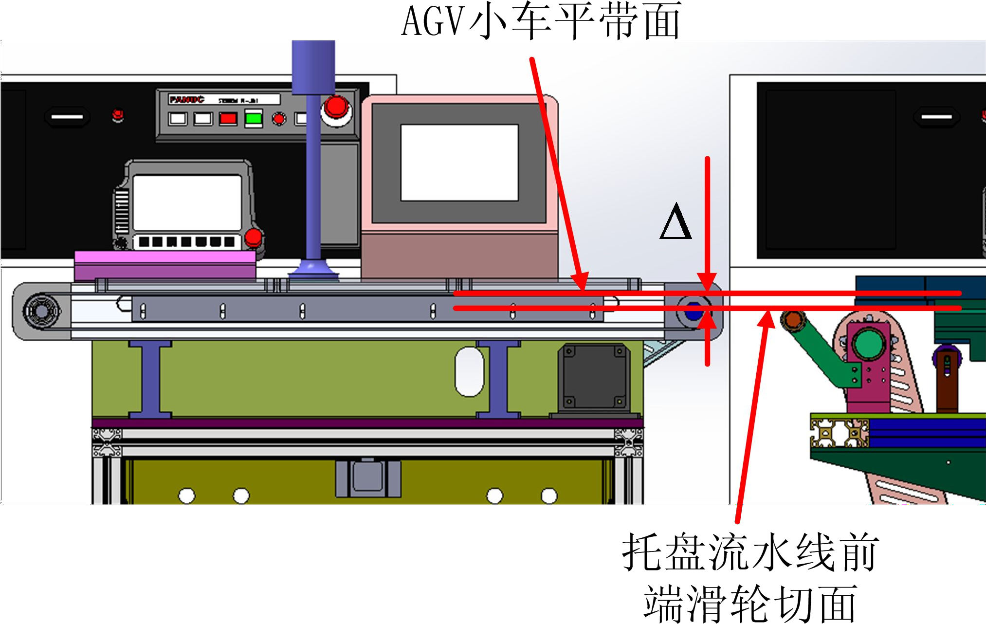 (4)?確保托盤流水線前端滑輪的平切面低于AGV?小車的平帶面;(見圖?2-2)。