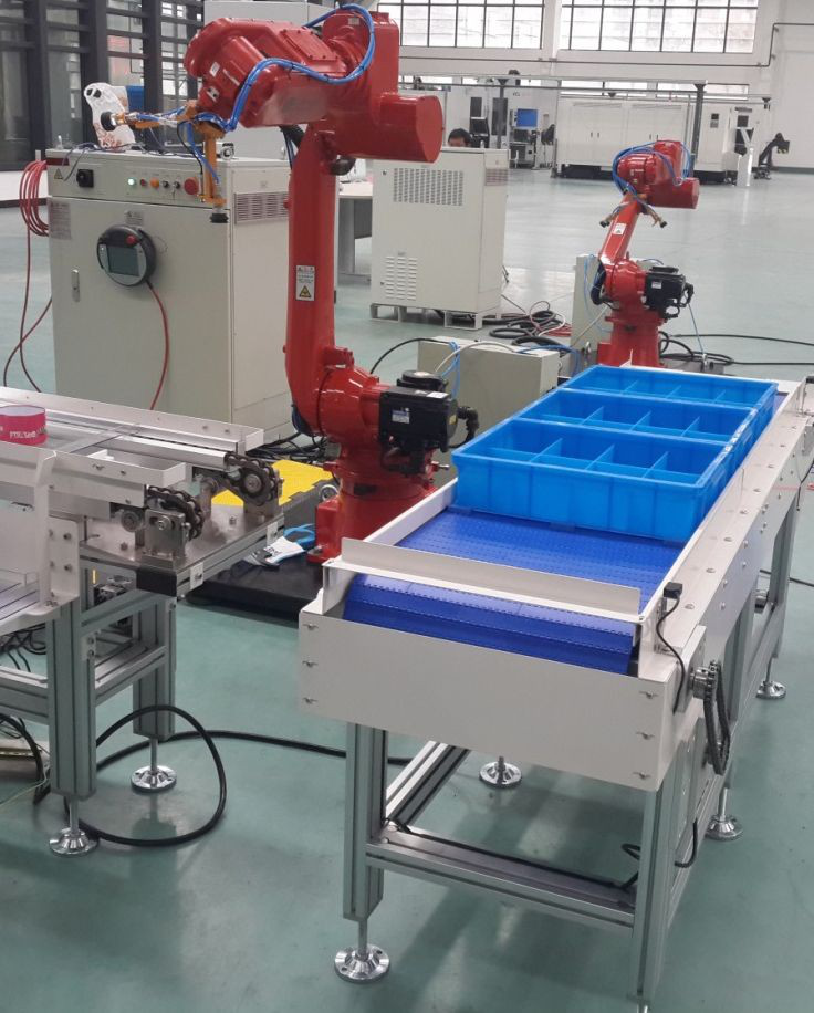 (3)?托盤流水線,負(fù)責(zé)把貨品托盤輸送到視覺檢測(cè)工位,經(jīng)視覺定位識(shí)別輸送到抓取工位;