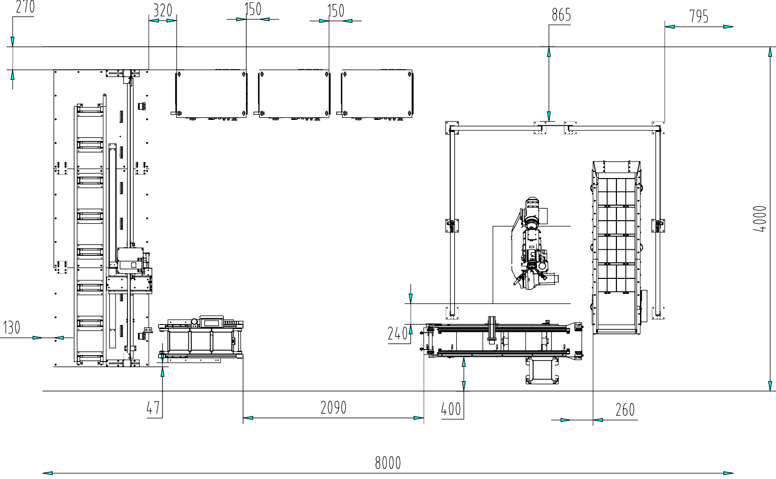 本設(shè)備共包括:工業(yè)機(jī)器人及控制柜、PLC?控制柜、托盤流水線、物品盒擺放流水線、AGV?小車等。比賽所用場(chǎng)地為?4m×8m,如圖?2-1?所示為裝備之間的大致布局,現(xiàn)場(chǎng)安裝時(shí)并不一定嚴(yán)格按照?qǐng)D中所標(biāo)尺寸安裝,允許有所變動(dòng)。在安裝時(shí)需要注意以下事項(xiàng):