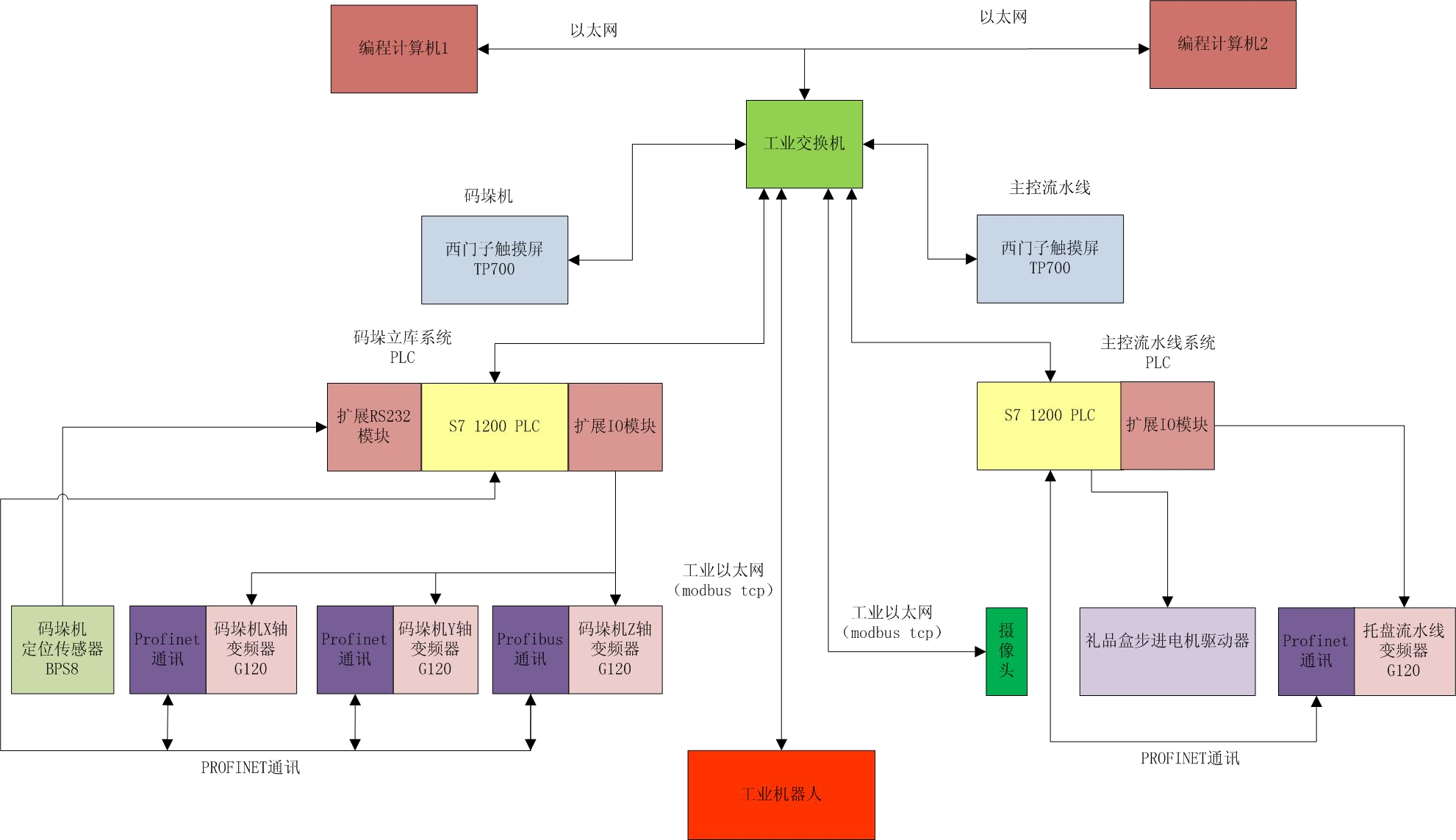 ? ? 如上圖所示,整個(gè)系統(tǒng)通過工業(yè)以太網(wǎng)總線,把工業(yè)機(jī)器人、主控流水線?PLC、碼垛機(jī)立庫系統(tǒng)?PLC、碼垛機(jī)立庫系統(tǒng)觸摸屏、主控流水線觸摸屏、視覺系統(tǒng)、變頻器以及編程開發(fā)計(jì)算機(jī)等均通過以太網(wǎng)連接。編程開發(fā)計(jì)算機(jī)負(fù)責(zé)開發(fā)調(diào)試程序、視覺系統(tǒng)特征識(shí)別開發(fā)以及機(jī)器人示教等編程。碼垛立庫系統(tǒng)和主控流水線觸摸屏負(fù)責(zé)管理碼垛立庫系統(tǒng)、主控流水線的運(yùn)行參數(shù),以及系統(tǒng)報(bào)警和提示信息等。