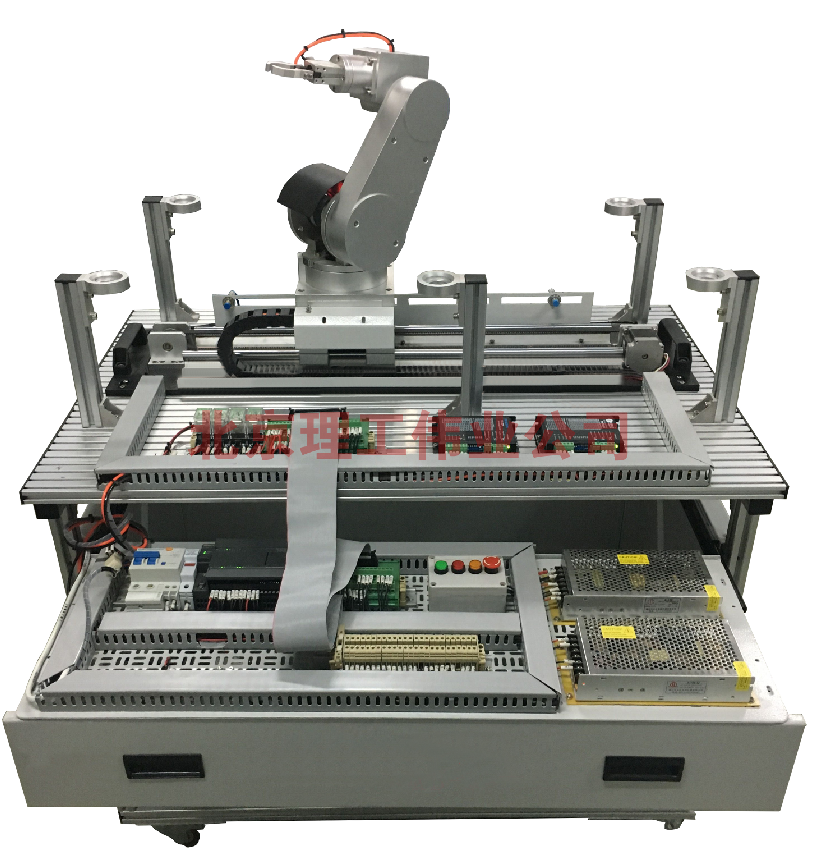 ? ? ? LGWD-05型?五自由度機器人實訓平臺由型材實訓桌、五自由度機器人、機器人控制器、步進電機及驅動器和電氣控制部分組成。通過PLC、機器人控制器對五自由度機器人進行控制,實現(xiàn)機器人在行程范圍內任一位置物體的抓取、移動、存放功能。適合自動檢測技術、信號連接及轉換技術、電機驅動技術、機械手技術、機器人技術、運動控制技術、傳感器檢測技術、位置檢測技術、電氣及PLC控制技術、可編程控制器及其應用等。