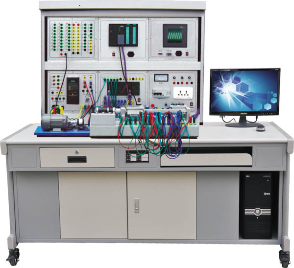 7、實(shí)驗(yàn)臺(tái)操作面板: PLC和變頻器的輸入輸出點(diǎn)均引到實(shí)驗(yàn)臺(tái)面板上,采用高絕緣的安全型插座及帶絕緣護(hù)套的高強(qiáng)度安全型實(shí)驗(yàn)導(dǎo)線,方便實(shí)驗(yàn)接線。包括各種按鈕、指示燈、繼電器等,配置電位器,可模擬傳感器的輸入信號(hào),方便學(xué)生自行設(shè)計(jì)實(shí)驗(yàn)。