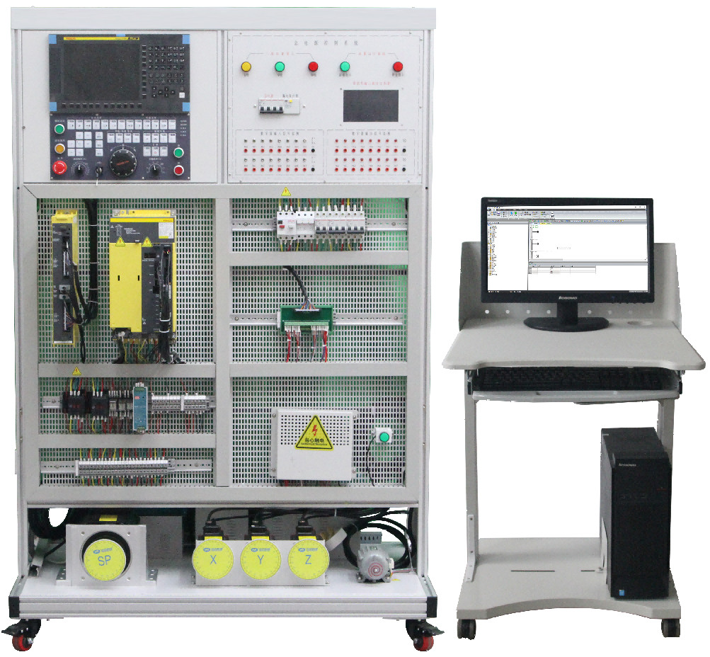 1.電氣控制平臺采用鋁合金型材、網(wǎng)孔板開放式設(shè)計(jì),立式結(jié)構(gòu),符合真實(shí)的數(shù)控電氣安裝環(huán)境,主要由數(shù)控系統(tǒng)、進(jìn)給驅(qū)動(dòng)、主軸單元、PMC單元、冷卻控制電路、接口單元、保護(hù)電路、電源電路等組成。該單元包含完整的數(shù)控銑床電氣控制部分,以及接口轉(zhuǎn)換單元。