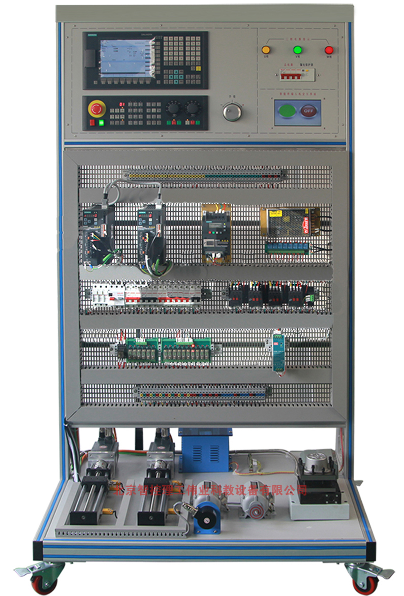 (1)電氣控制平臺采用鋁合金型材、網(wǎng)孔板開放式設計,立式結構,符合真實的數(shù)控電氣安裝環(huán)境,主要由數(shù)控系統(tǒng)、進給驅動、主軸單元、PMC單元、刀架控制電路、冷卻控制電路、接口單元、保護電路、電源電路等組成。該單元包含完整的數(shù)控車床電氣控制部分,以及接口轉換單元。