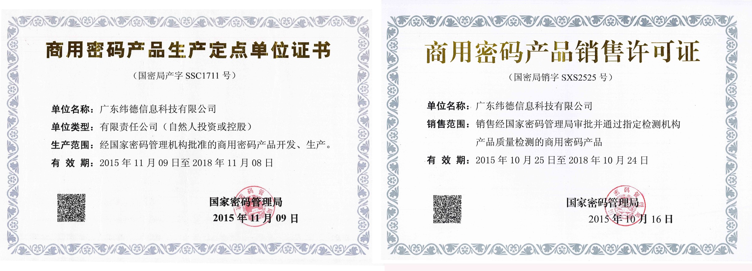 近年來,在商用密碼領(lǐng)域,緯德研發(fā)出了一系列的商密產(chǎn)品,填補(bǔ)了我國商密技術(shù)的空白,公司范化的企業(yè)管理及濃厚的企業(yè)文化得到了密碼局領(lǐng)導(dǎo)們的贊賞。在一層層的審核篩選中,廣東緯德斬獲了“國家商用密碼產(chǎn)品生產(chǎn)定點單位”及“商用密碼產(chǎn)品銷售許可證”兩大榮譽(yù)稱號!