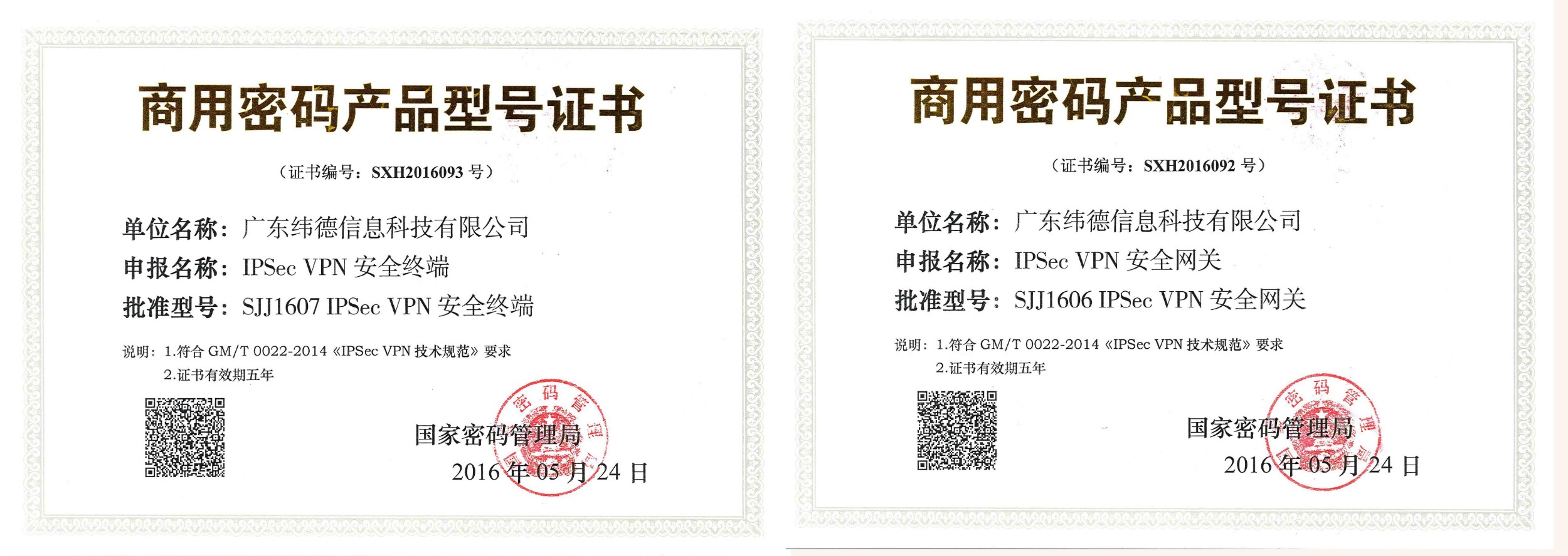 近日,廣東緯德“IPSec VPN安全網(wǎng)關(guān)”及“IPSec VPN安全終端”通過了國家密碼局的商用密碼組織產(chǎn)品檢測及專家鑒定,獲得了由該局頒發(fā)的《商用密碼產(chǎn)品型號證書》。目前廣東緯德已經(jīng)獲得國家密碼局頒發(fā)的《商用密碼產(chǎn)品生產(chǎn)定點(diǎn)單位證書》、《商用密碼產(chǎn)品銷售許可證》、《商用密碼產(chǎn)品型號證書-IPSec VPN安全網(wǎng)關(guān)》、《商用密碼產(chǎn)品型號證書-IPSec VPN安全終端》共計(jì)四項(xiàng)證書。