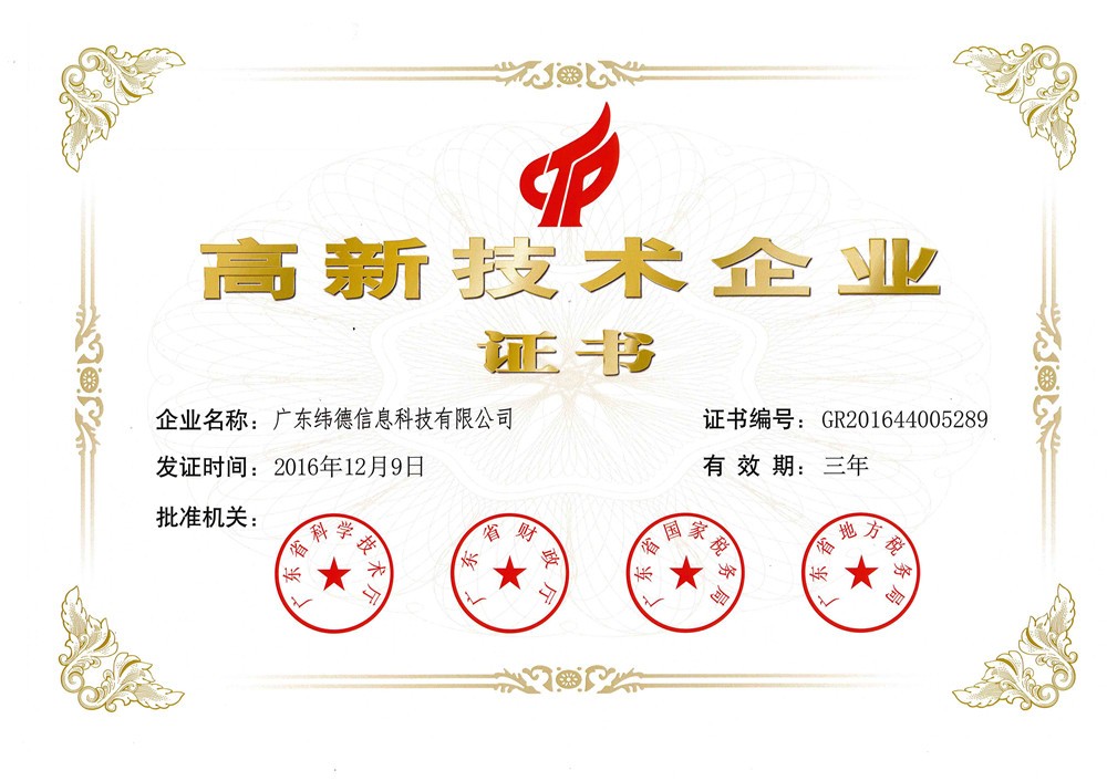 經(jīng)過(guò)嚴(yán)格的測(cè)評(píng)和審批程序,廣東緯德憑借過(guò)硬的技術(shù)實(shí)力,最終獲得 “國(guó)家高新技術(shù)企業(yè)”證書(shū)。